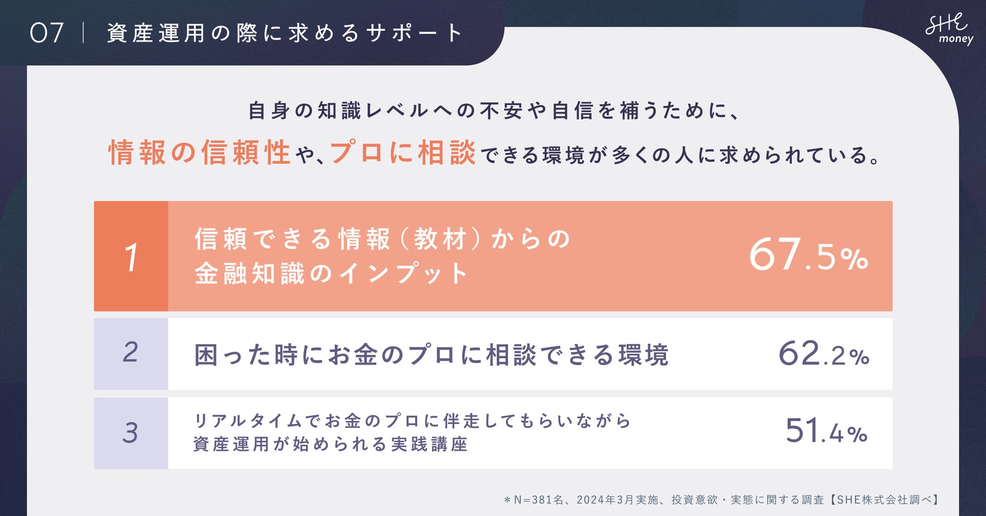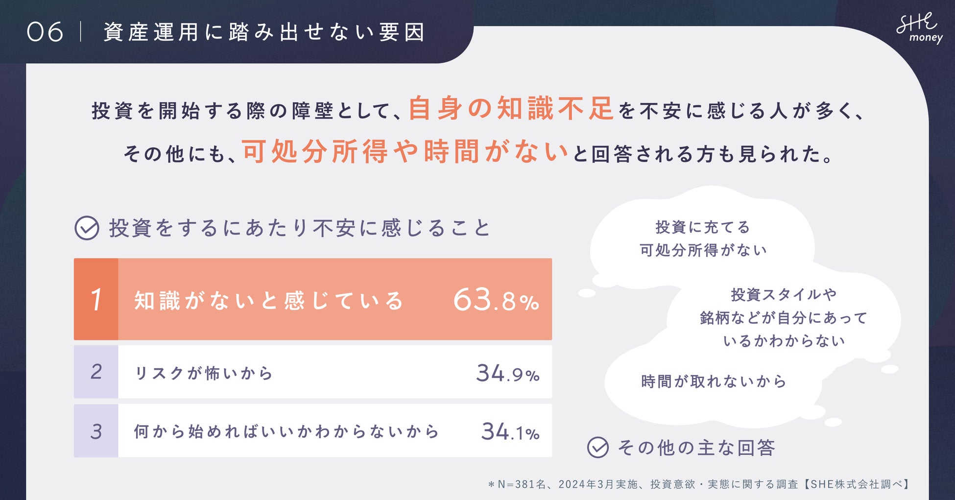 【設問06】に「信頼できる情報を得て不安やリスクを無くしたい」という回答が多かったことからも、信頼できる一次情報でのインプットや専門家とコミュニケーションできる環境を求める声が多く見られました。