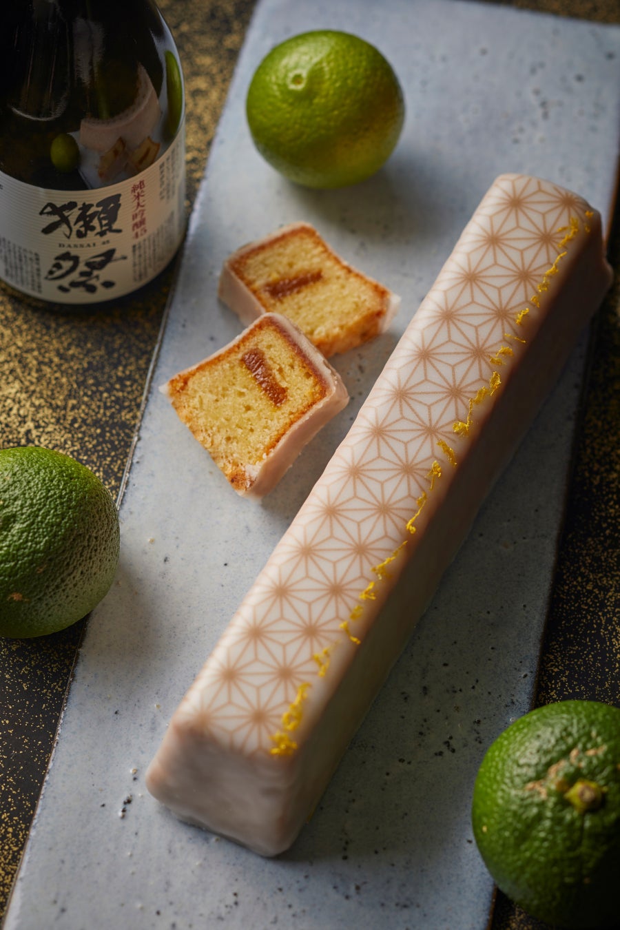 加藤パティシエの出身地・山口県の名産「獺祭 純米大吟醸45」と、県オリジナル柑橘「ゆずきち」を組み合わせた受賞作「獺祭とゆずきちが織りなす ~幸せますケーク~」。