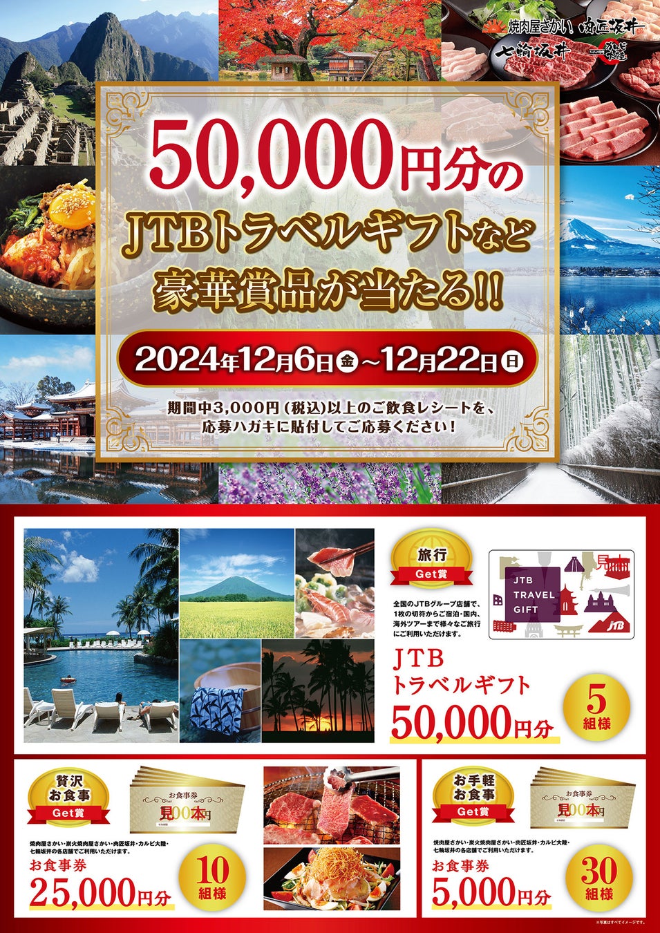 焼肉を食べて、ギフト商品を当てよう!焼肉屋さかい、炭火焼肉屋さかい、肉匠坂井、七輪坂井、カルビ大陸では12月6日(金)~ 12月22日(日)までに各店舗にて3,000円(税込)以上ご飲食をいただいたお客様にJTBトラベルギフト50,000円分などが当たりますキャンペーンを行います。応募ハガキに3,000円以上のレシートを貼付して店内の応募箱もしくは郵便ポストにご投函ください。歳末のビッグな運だめしを美味しい焼肉と共にチャレンジしてください。皆さまのご来店をスタッフ一同お待ちしております。