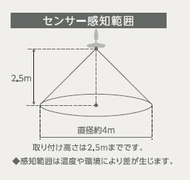 センサー感知範囲:(約)2.5m(設置高さ2.5m以内) × 直径4m