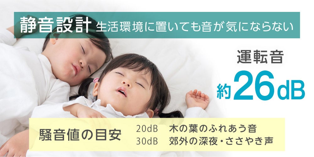 運転⾳はとても静かで約26db程度です。⼀⼈暮らしの⽅のお部屋や個室などの限られた空間、赤ちゃんや小さなお子様がいらっしゃるご家庭でも安心してお使いいただけます。