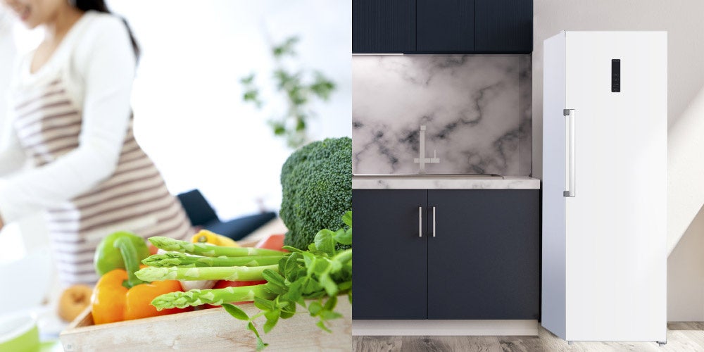 横幅は60cmで、場所を取らない省スペースサイズです。また、インテリアになじむシンプルなデザインなので、キッチンに置けない場合はリビングに置くこともできます。既にご使用されている冷蔵庫・冷凍庫にプラスして使用する、置き場所を選ばないセカンド冷凍庫としてお気軽にお使いいただけます。