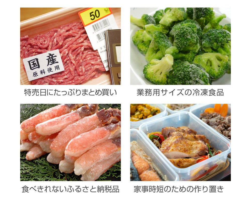 これらを設置したことで、サイズや量に合わせて食材をすっきり収納することが可能になりました。特売日のまとめ買い、業務用サイズの冷凍食材、賞味期限までに全部食べられるかわからないふるさと納税の返礼品、節約と時短の為に大量に作ったおかずなど、様々な食材を整理して保管することができるので、これらの食材の専用冷凍庫にぴったりの製品です。