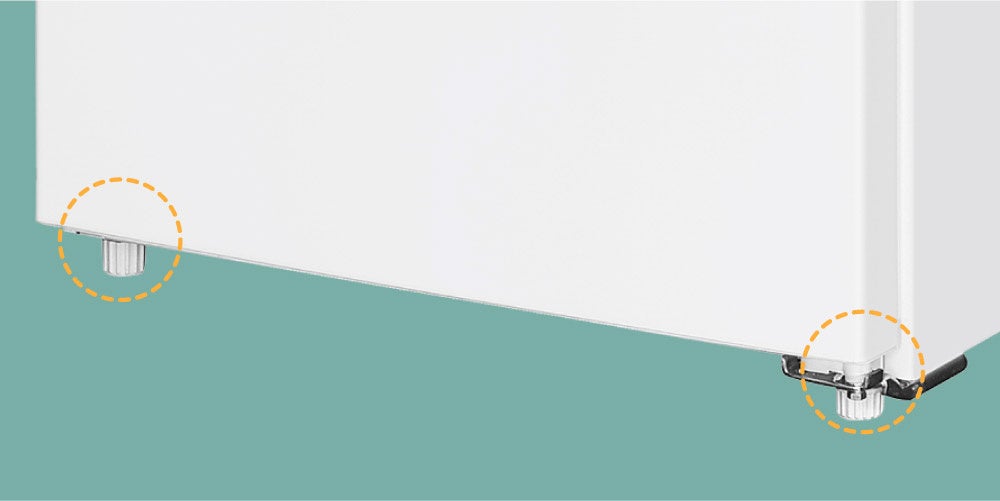 本体底面には、高さを調節して本体を水平に調整することができる調節脚が取り付けられております。また、底面の設置面積が減少するため、床へのダメージを防止いたします。