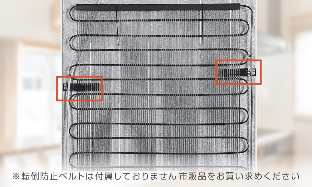 冷凍庫の背面には、ベルト取り付け用の穴がございます。これによって市販の転倒防止ベルトを取り付け壁に固定することができ、災害時の転倒を防止することができます。