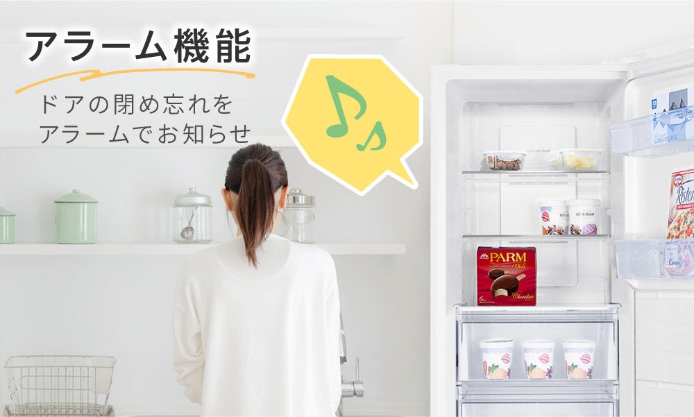 ドアが開いた状態のまま90秒間経過すると、アラームが鳴り閉め忘れをお知らせしますので「閉め忘れで食材が溶けてしまった…。」といったトラブルを回避できます。