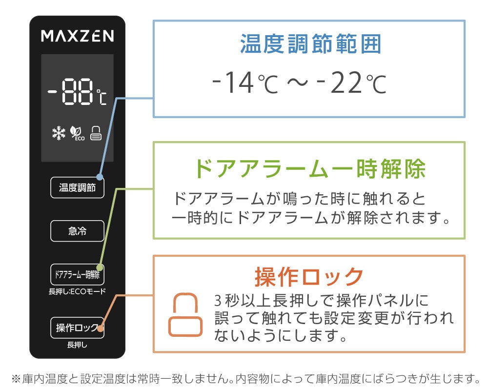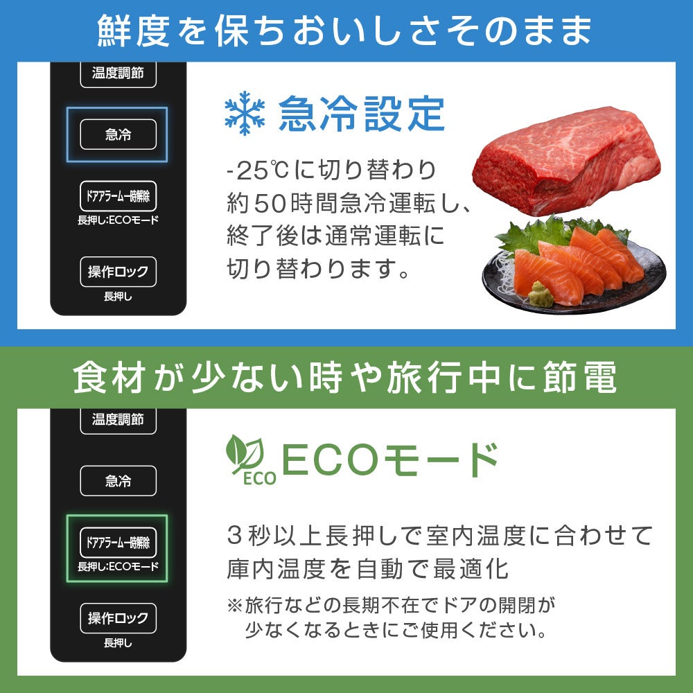 庫内の温度を-25℃に切り替え約50時間運転する急冷設定と、室内温度に合わせて冷凍庫内の温度を最適化するECOモードを搭載しております。急冷設定はドリップが気になる肉や魚を冷凍するときに、ECOモードは旅行等の長期不在や食材が少ないときに活躍いたします。