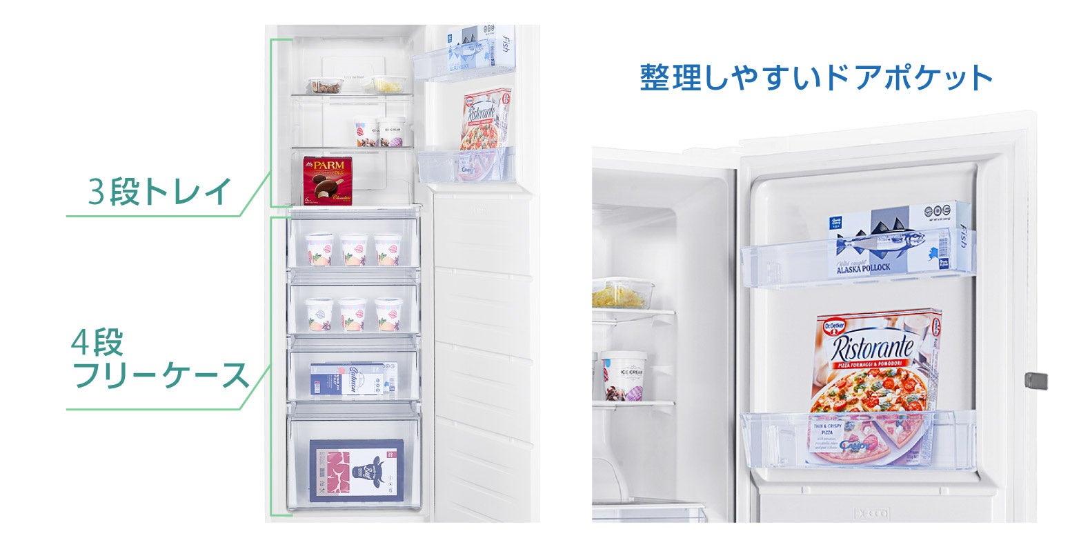 ■3段トレイ、フリーケース、ドアポケットで様々な食材の専用冷凍庫に!