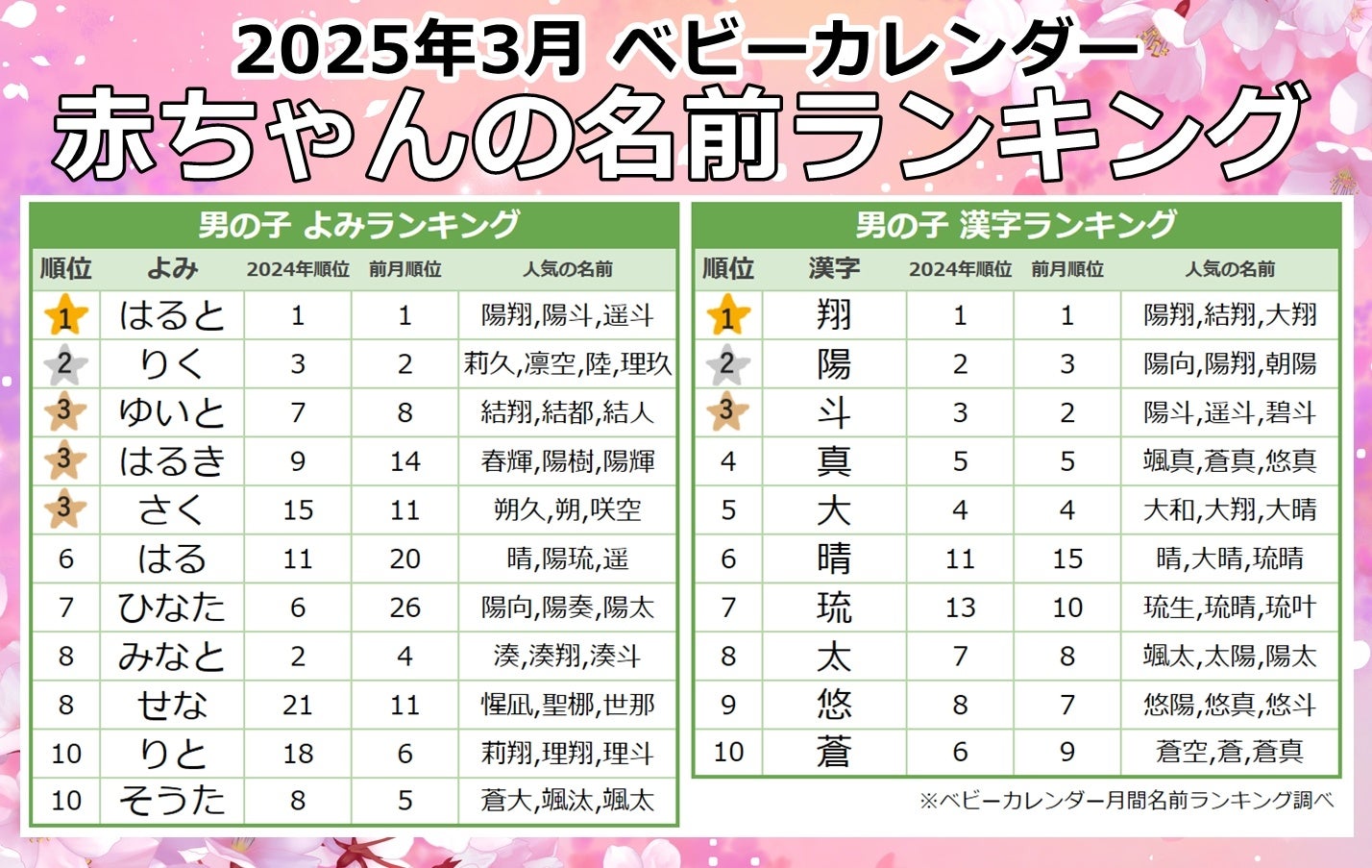 2025年『3月生まれベビーの名付けトレンド』発表!「春ネーム」が特大トレンド!春らしい名前が人気急上昇!女の子は「サクラネーム」・「フラワーネーム」、男の子は「はるネーム」が人気★