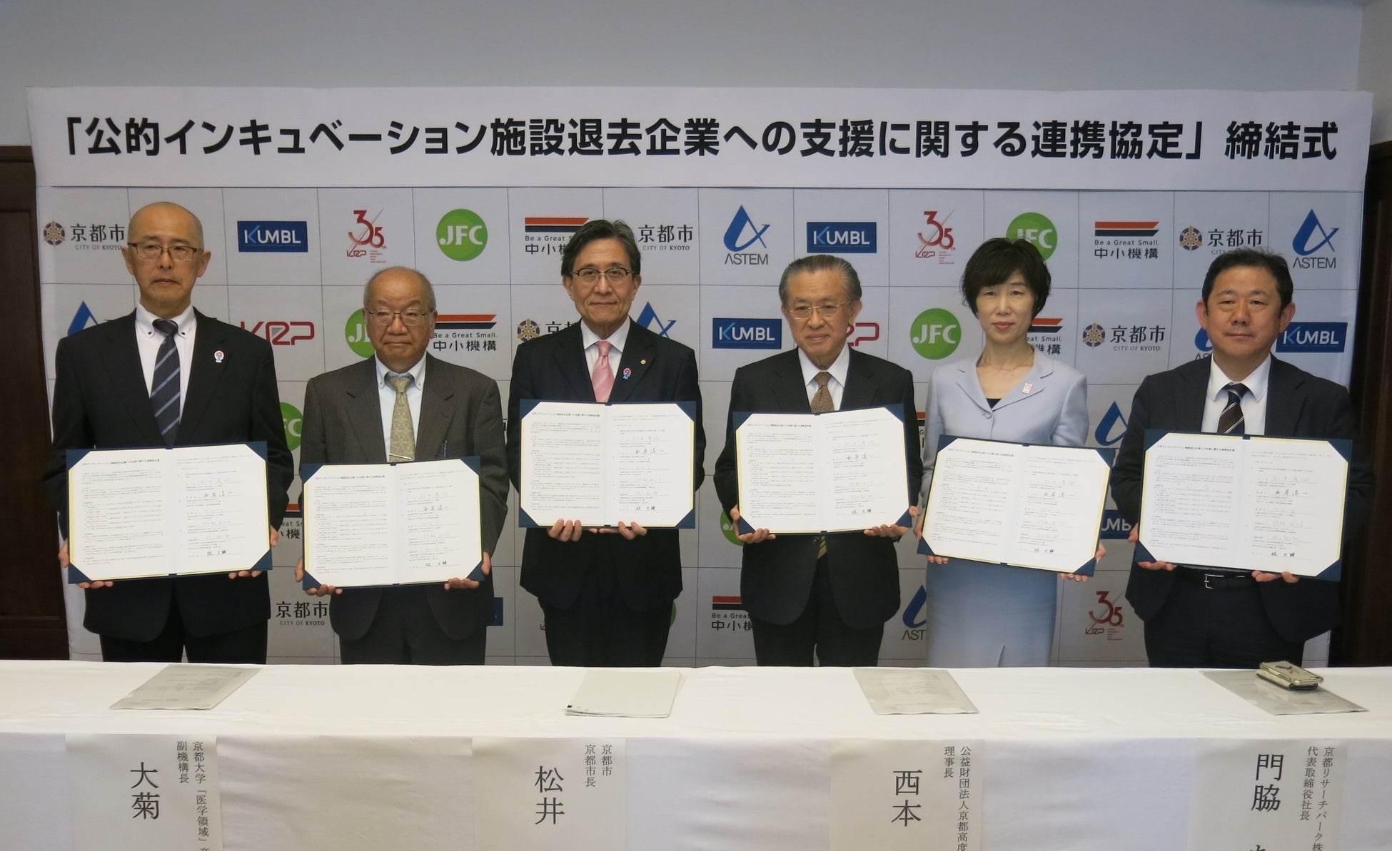 この度、京都市が新たに策定する“新京都戦略”の下、更なる取組強化を図る企業立地プロジェクトの第1弾として、新たに「京都大学「医学領域」産学連携推進機構」及び「公益財団法人京都高度技術研究所」とともに、6者で連携協定を締結しました。
