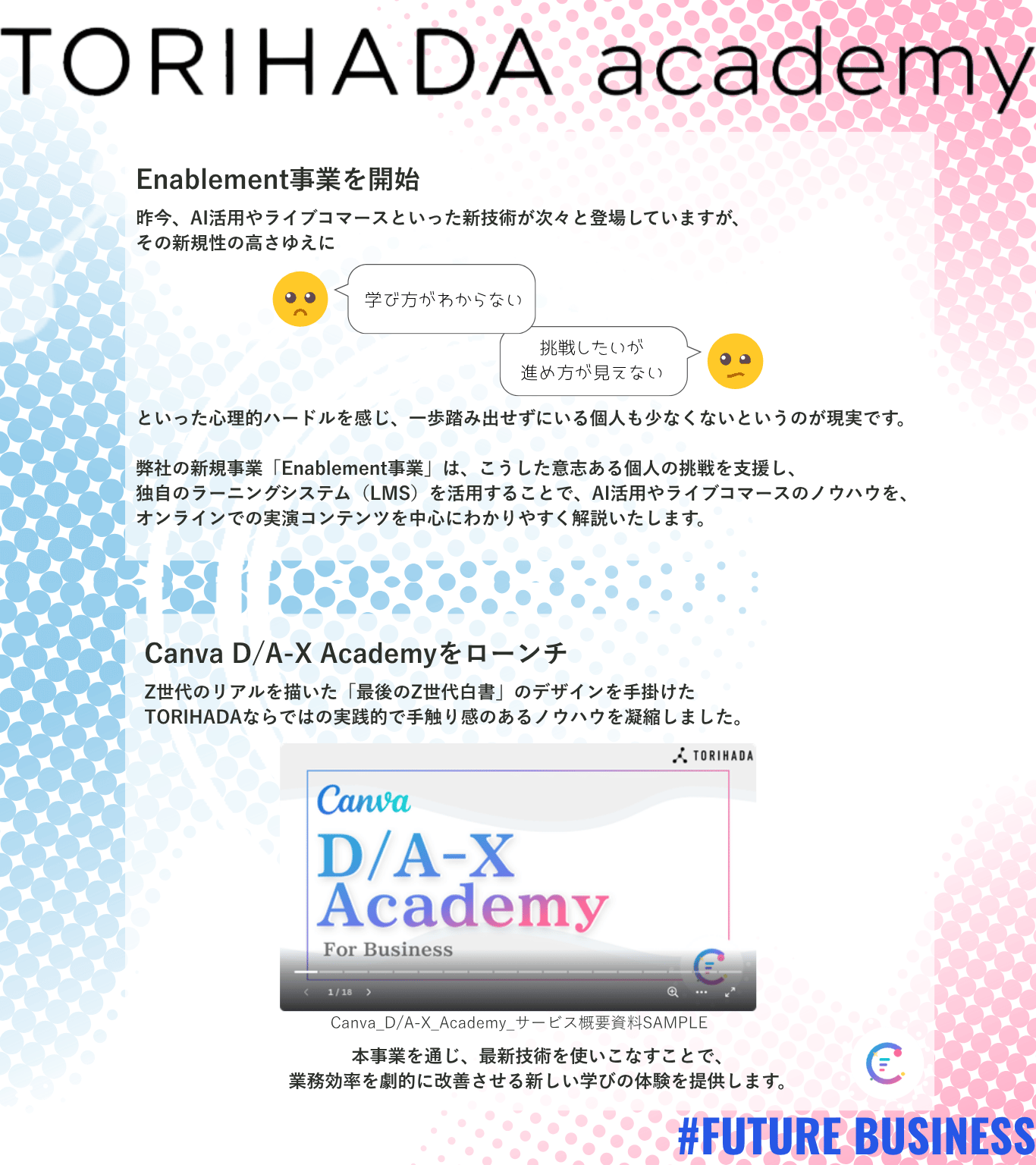 クリエイターの音楽活動とゲーム配信に協力をするレーベル事業、ライブコマースやAIのノウハウを学べるTORIHADA ACADEMY事業など、クリエイターエコノミーを加速させる事業を複数展開していきます。