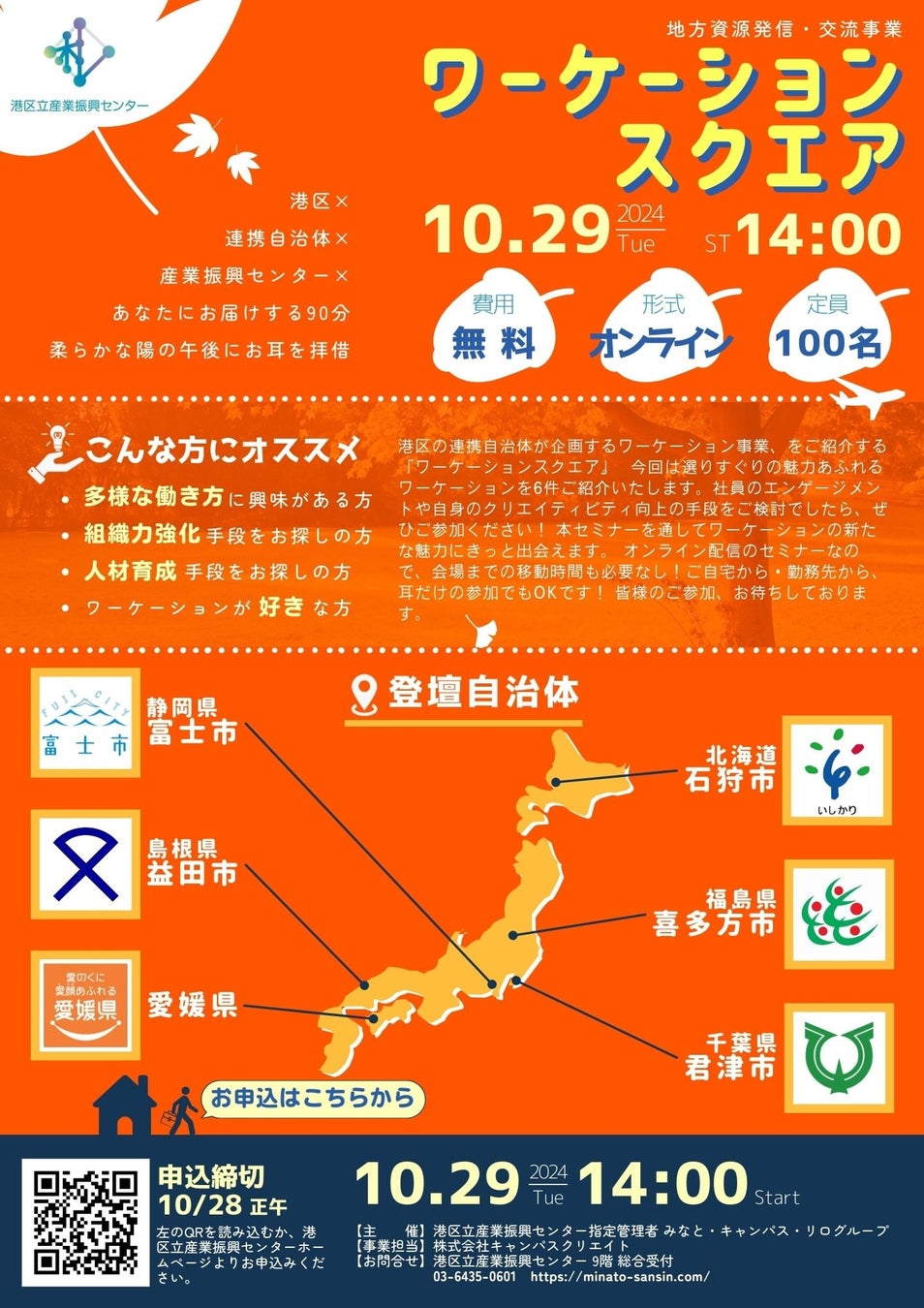 港区立産業振興センター(所在地:東京都港区)では、2024年10月29日に「ワーケーションスクエア 2024」をオンラインで開催いたします。登壇する自治体は【北海道石狩市 / 福島県喜多方市 / 千葉県君津市 / 静岡県富士市 / 島根県益田市 / 愛媛県】の6自治体で、1自治体ずつプレゼン形式でご紹介。事業者の生産性や満足度の向上、新たなビジネスチャンスの機会を創出します。