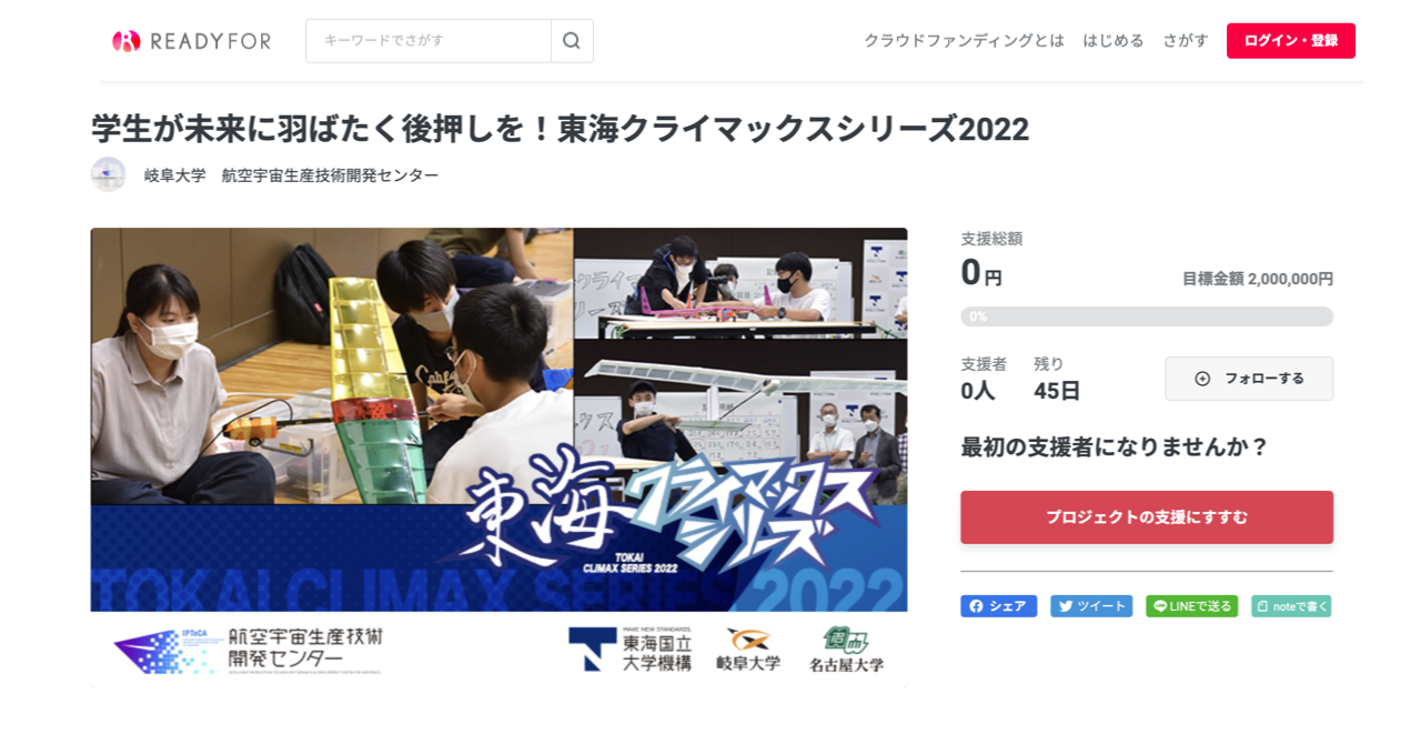航空産業界の即戦力となる、航空宇宙設計・生産融合人材育成プログラムの一環である「東海クライマックスシリーズ」競技会をクラウドファンディングを通じて、活動の継続を目指すことで学生が確かな技術を身に付け、世界で活躍する生産技術者となれるよう後押しすることを目指します。