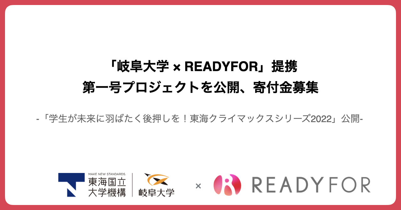 日本初・国内最大級のクラウドファンディングサービス「READYFOR」を運営するREADYFOR株式会社(本社:東京都千代田区、代表取締役CEO:米良はるか)と国立大学法人東海国立大学機構岐阜大学(所在地:岐阜県岐阜市、学長:森脇久隆)は、クラウドファンディングを活用した寄付金・研究費用獲得のため、業務提携を締結いたしました。