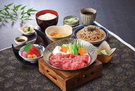 黒毛和牛の「宮崎牛」を使用した牛すき鍋とお刺身、石挽そばがセットになった和膳メニュー。