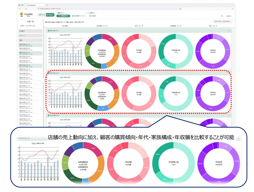 ✓複数の店舗を一覧で比較できるダッシュボードを搭載しており、店舗別・業態別などのグループを作成して顧客層等のデータを比較分析することが可能です。