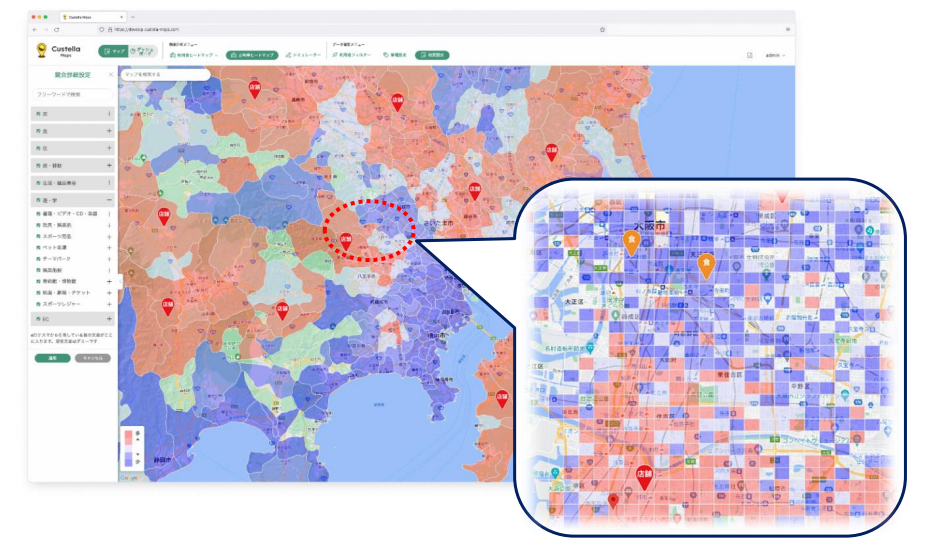 ✓自社と同業種の購買傾向をヒートマップで表現し、”勝ちエリア”と”負けエリア”の境界線を可視化することで、それぞれの店舗の課題を理解できます。