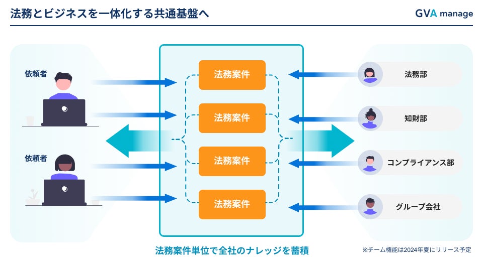 2024年夏にリリース予定のチーム機能と合わせて活用することにより、法務部門だけでなく近接部門である知財部門・コンプライアンス部門、またグループ会社の法務部門にも活用範囲を広げることが可能となります。