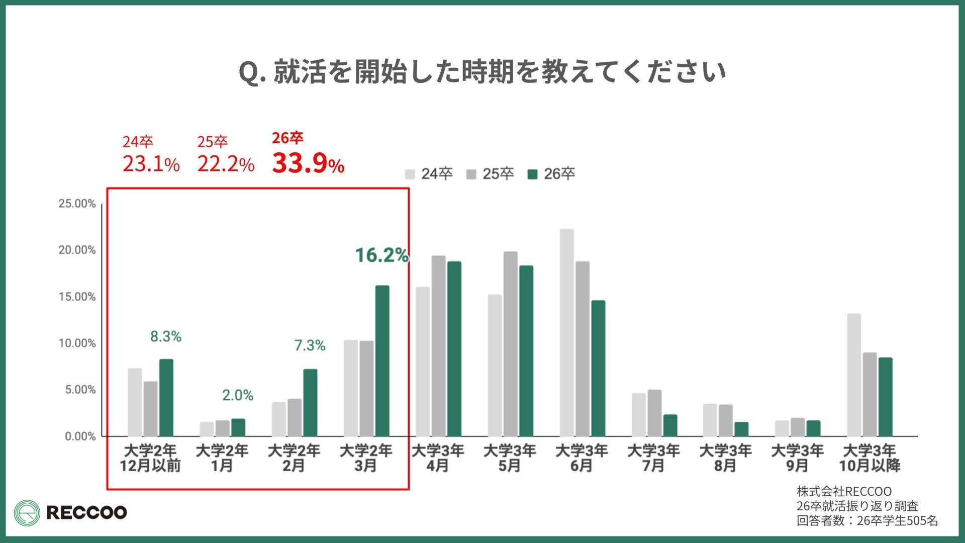 25卒よりも明確に前倒し傾向が進行。「大学2年の3月以前に就活を開始した」学生は前年比で10ポイント以上増加し、年内にエントリーを開始する学生は7.4ポイント増。大学2年生から企業と接点を持つ「超早期型採用」が主流化しつつあります。