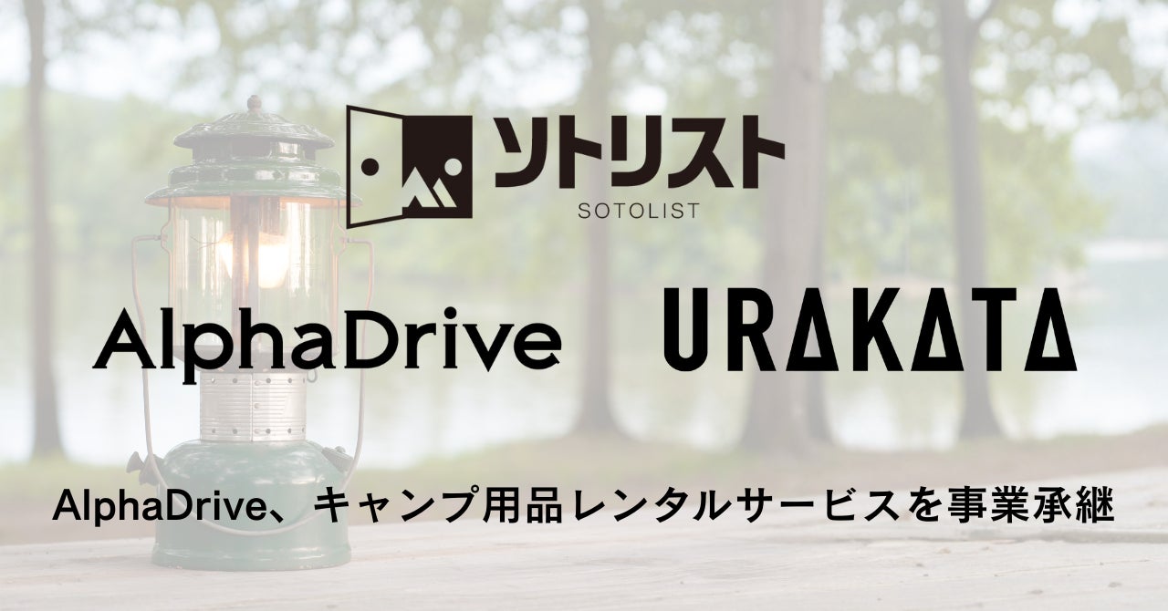 株式会社アルファドライブ(本社:東京都千代田区、代表取締役社長 兼 CEO 麻生要一、以下「AlphaDrive」)は、株式会社URAKATA(本社:沖縄県浦添市、代表取締役:山田慎也、以下URAKATA)より、キャンプ用品レンタルサービス「ソトリスト」の事業譲渡を受けました。
