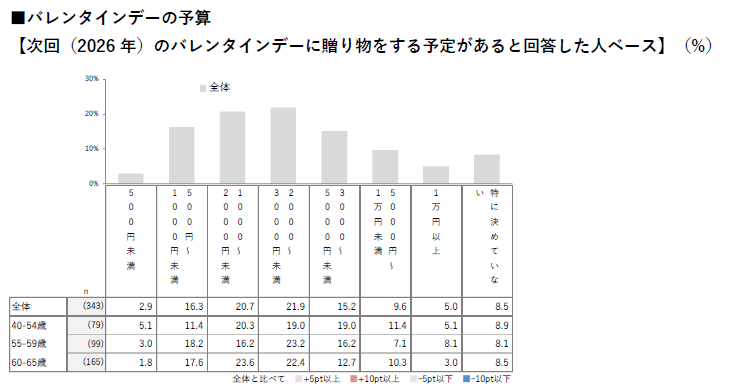 世代別では、40~54歳は「500~1,000円未満」、55~59歳と60~65歳は「1,000~2,000円未満」が最多。高すぎず、低すぎず無理のない範囲で楽しむスタイルが主流に。若年層ほど「期待する贈り物(お返し)の金額」が低く、いわゆる "倍返し" への期待は薄れつつある。