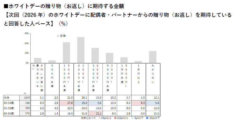 ■5割以上が「ホワイトデーの贈り物(お返し)を期待していない」と回答。配偶者・パートナーからの贈り物(お返し)に期待する金額は若年層ほど低く、いわゆる "倍返し" への期待は薄れつつある