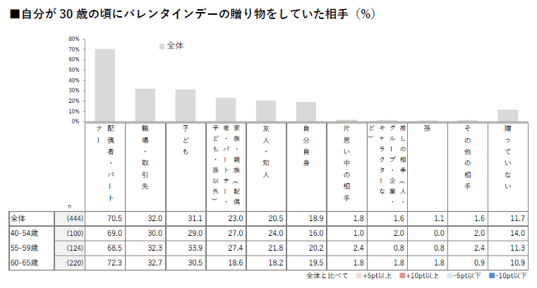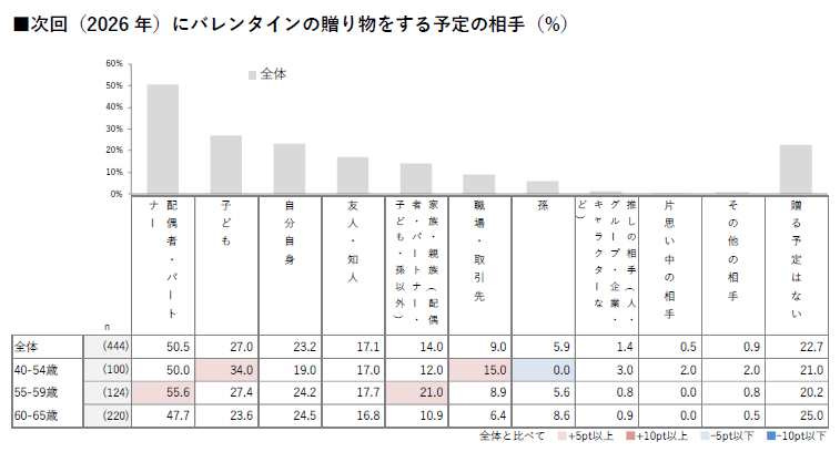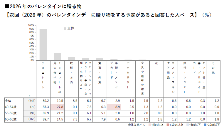 40~54歳では「チョコレート以外の食べ物(27.8%)」が他の世代に比べ高い。定番が主流の中、若年層ほど楽しみ方に広がりが見られる。