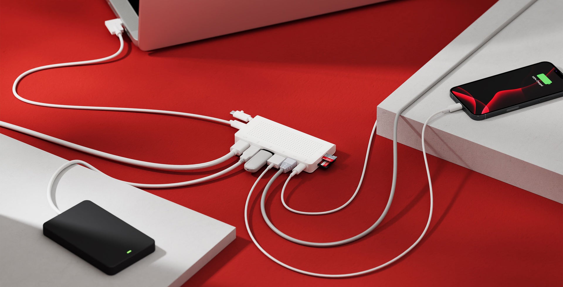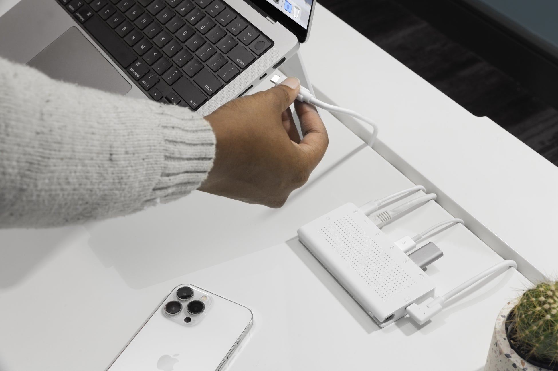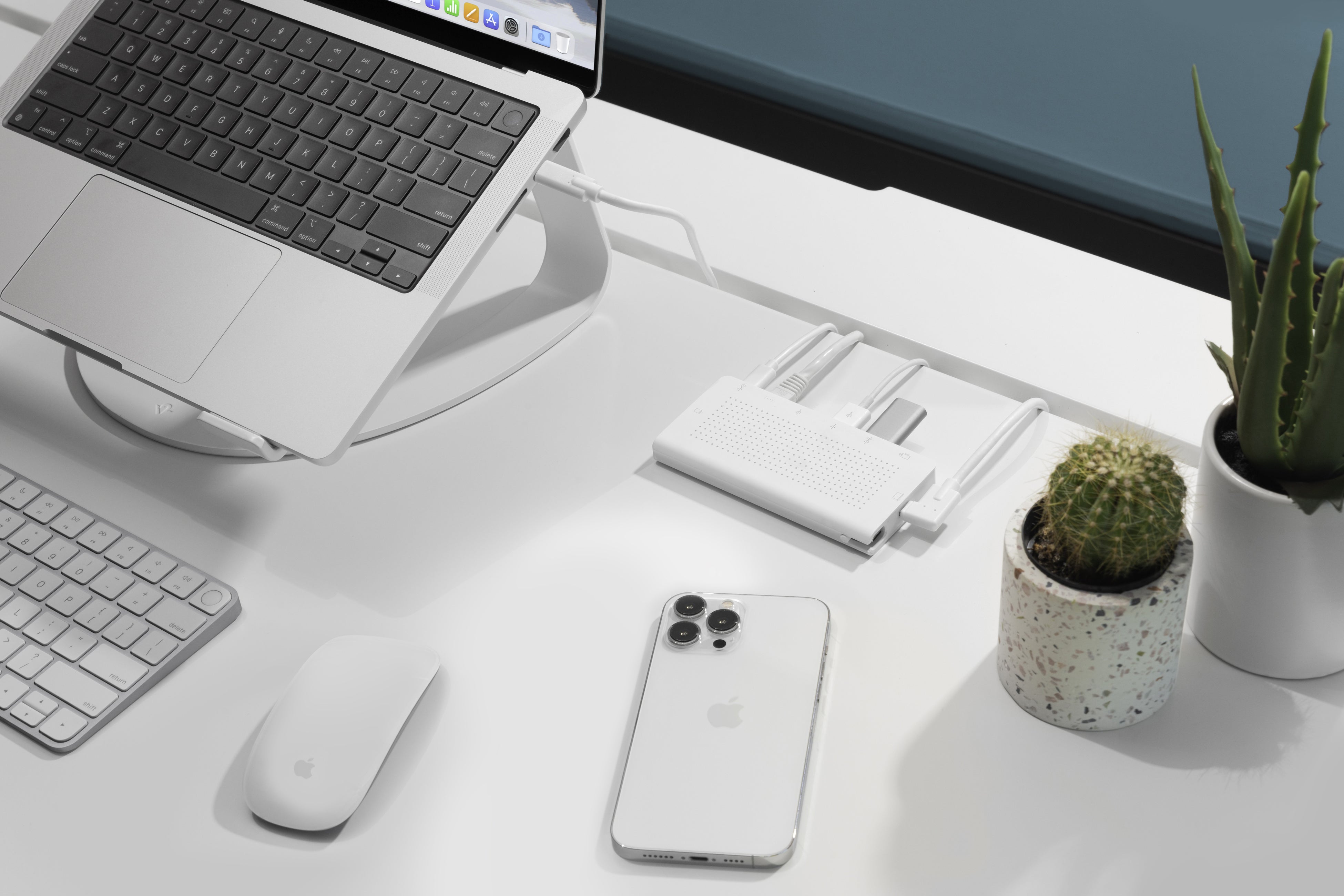 StayGo USB-C Hub は自宅でも外出先でも活躍できます。オフィスや自宅での利用に適したデスク用ケーブル(約1m)と、本体に収納可能なトラベルケーブルの2本のケーブルが同梱されているので、作業環境に合わせてケーブルを切り替えて利用できます。マットホワイトのアルミニウムボディはプラスチック製のUSB-Cハブと比較して、高い放熱性とより優れた温度制御を備えています。