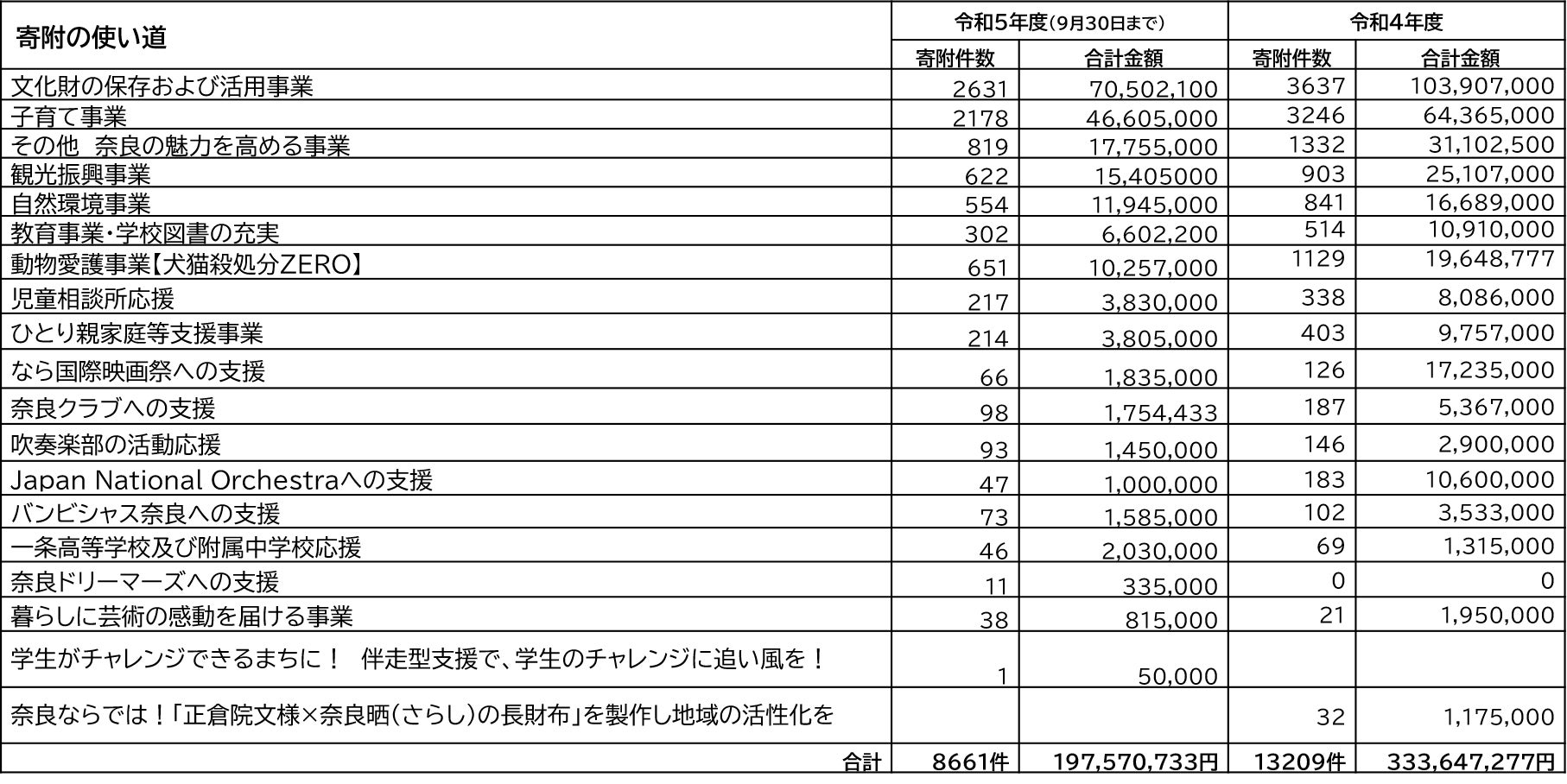 奈良市の令和3年度の寄附額は2億2,492万1,233円、令和4年度の寄附額は3億3,364万7,277円(受附件数:13,209件)となり、県内ランキングでは受附件数で1位となりました。また、令和4年度はふるさと納税の制度開始以来最高の寄附額となりました。なお、今年度は9月末日現在で累計1億9,700万円。これは前年度の同日時点の金額8,800万円を大幅に超えており、順調に推移しています。
