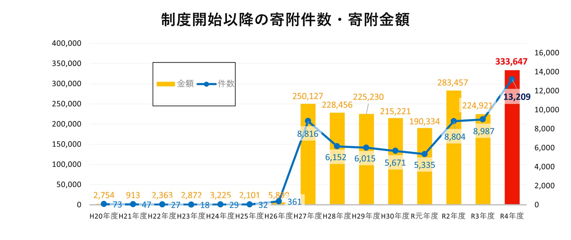 ◆令和4年度の寄附総額は3億3,364万7,277円。受附件数は13,209件で県内1位。ふるさと納税の制度開始以来最高の寄附額となった。