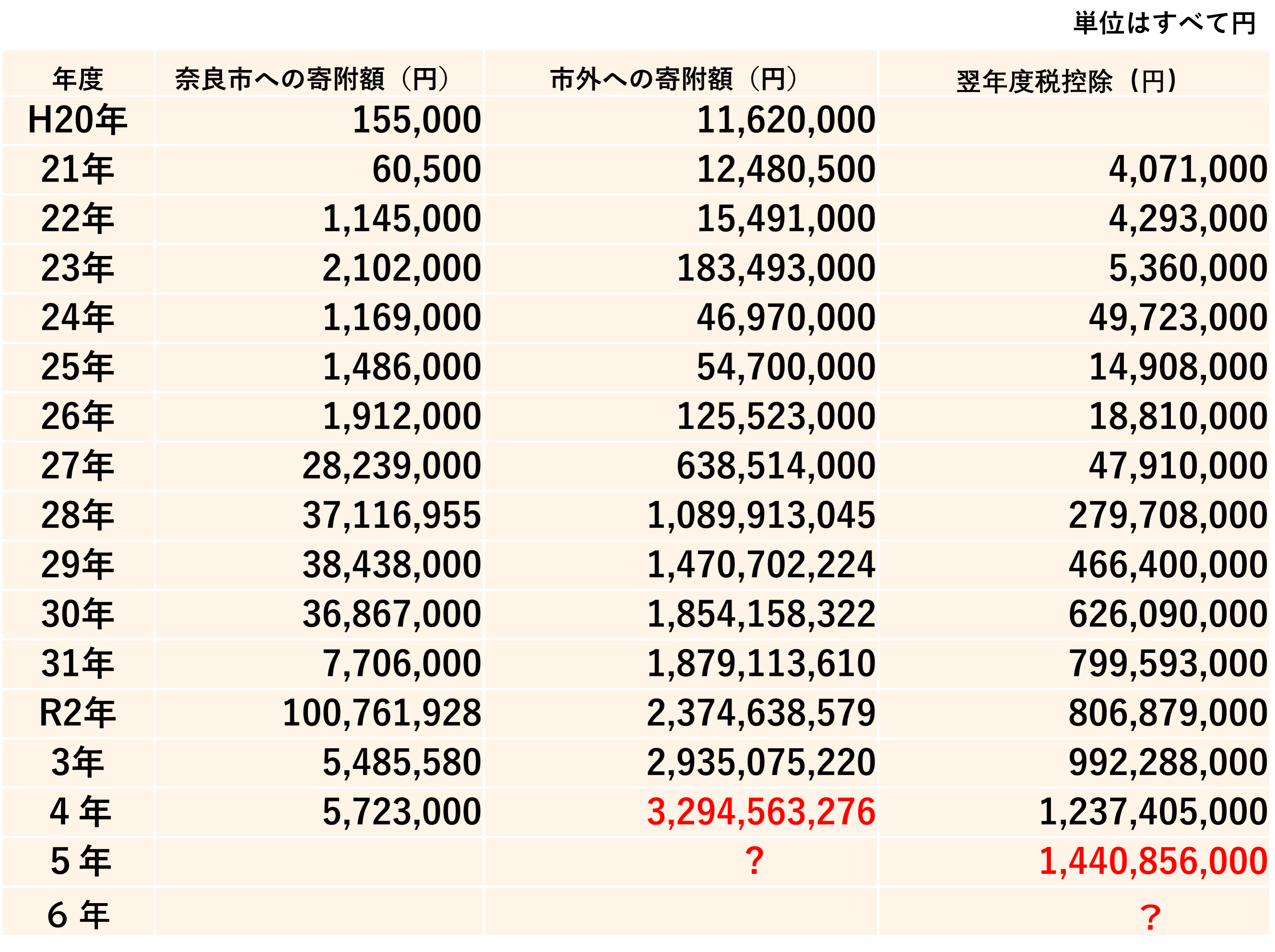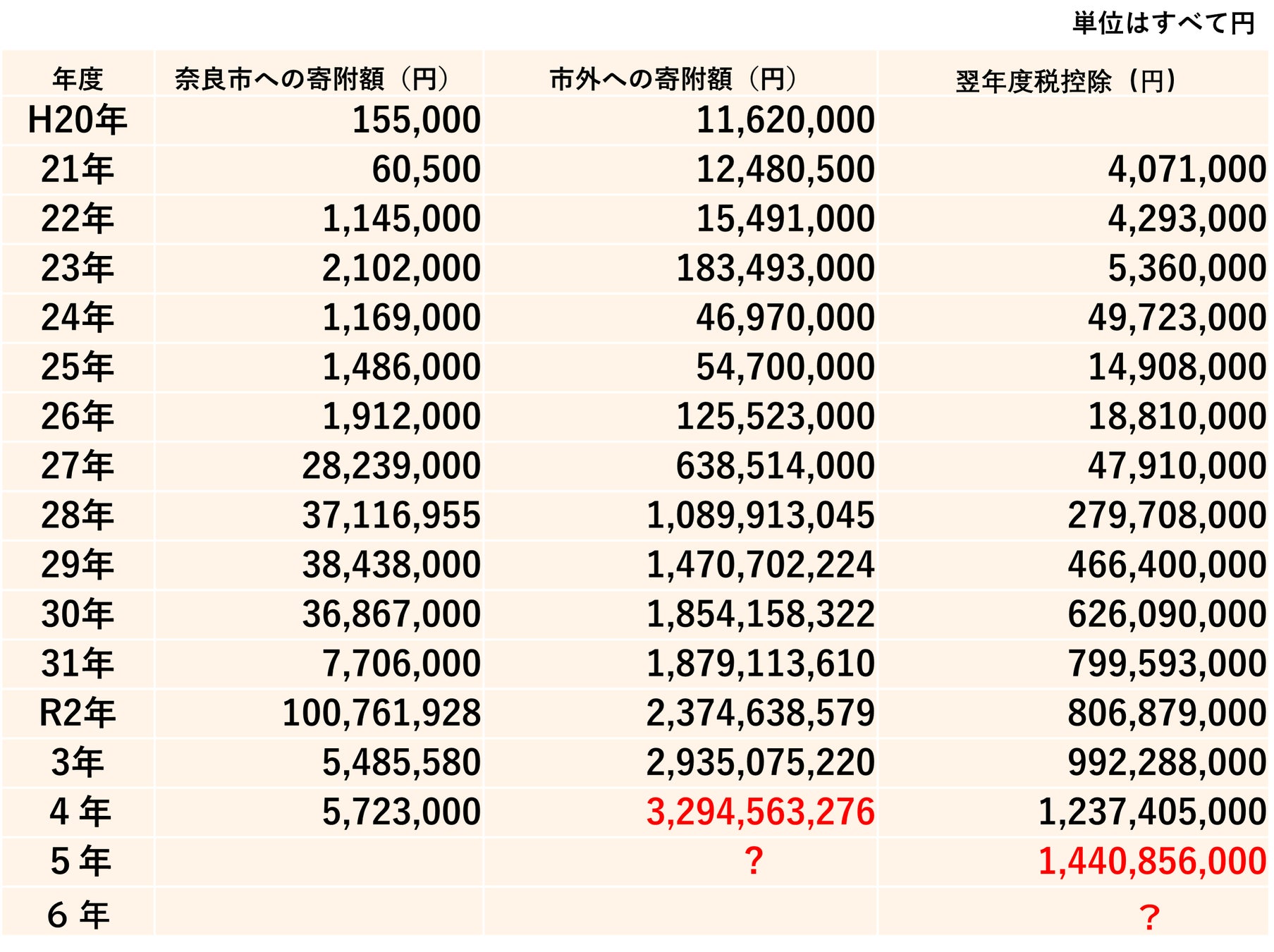 令和4年度の奈良市民が市外に寄附した総額が約33億円、そのうち市民税控除額が約14億円で、実質の市外流出が14億円となっています。