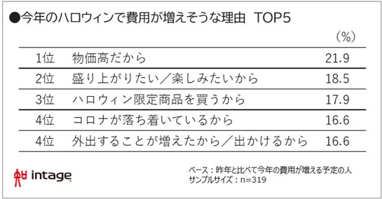 費用が昨年に比べて「増える」と回答した人に、その理由を複数回答で聴取しました。最も多かったのは「物価高だから」で22%。次いで、「盛り上がりたい/楽しみたいから」(19%)、「ハロウィン限定商品を買うから」(18%)、「コロナが落ち着いているから」(17%)、「外出することが増えたから/出かけるから」(17%)が続きました(図表4)。