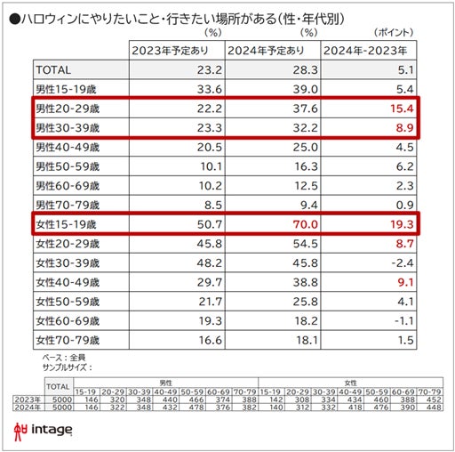 ・ハロウィンの予定がある人は約3割で昨年の1.2倍。女性15-19歳は7割に達し、男性20~30代も増加