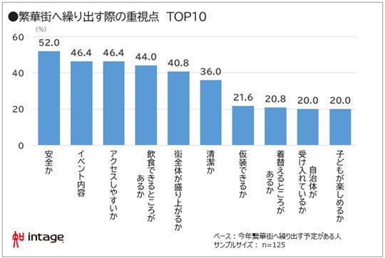 最後に、昨年「渋谷に来ないでほしい」と呼びかけがあり、今年は渋谷区と新宿区合同で対策が行われることになりました※1が、今年繁華街へ繰り出す予定の人はどのように考えているのでしょうか。重視点を聞きました。最も重視するのは「安全か」で52%。「自治体が受け入れているか」は9位で20%で、一都三県の人に絞っても同様に20%でした。「イベント内容」「飲食できるところがあるか」「街全体が盛り上がるか」「仮装できるか」といった『楽しみ』に関する点は多くの人で重視されている一方で、「安全か」「清潔か」「着替えるところがあるか」「自治体が受け入れているか」といった『安全・安心・モラル』面も一定重視されています(図表6)。