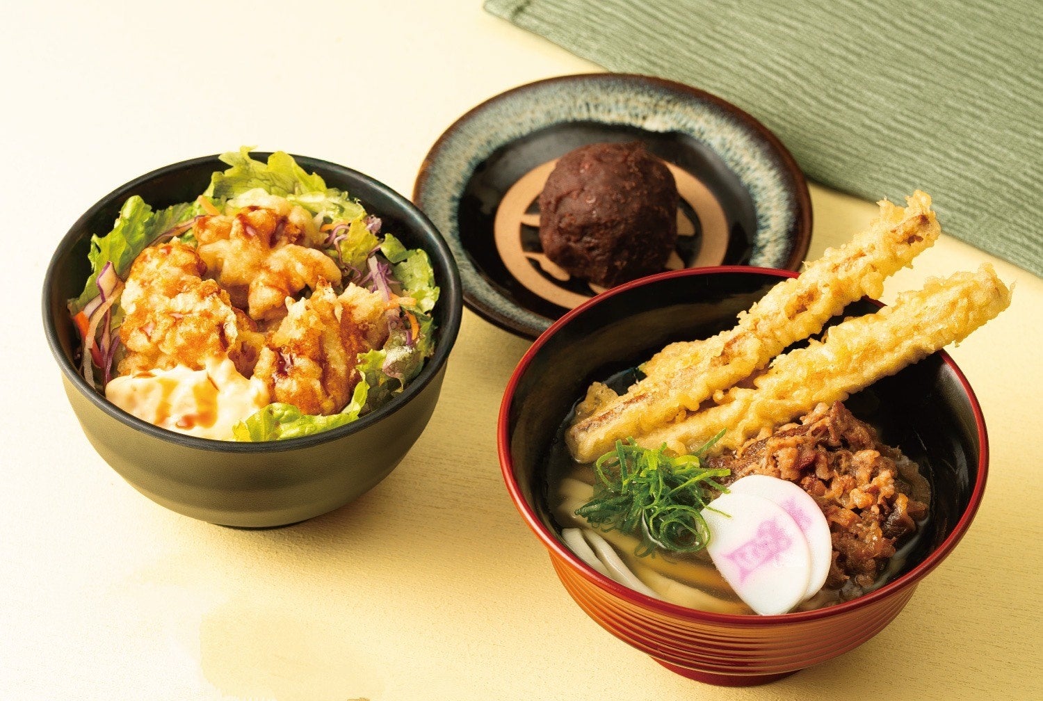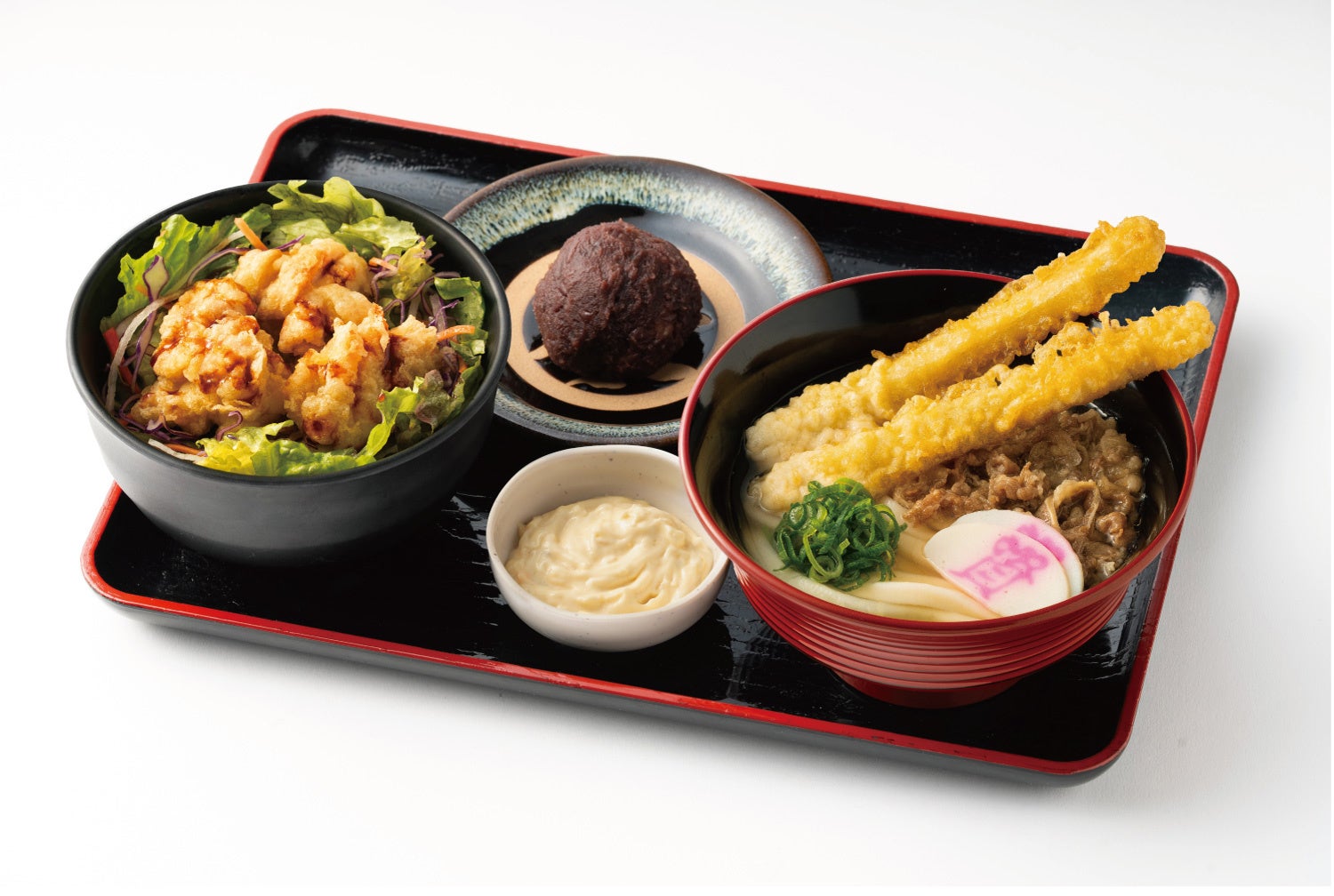 付属の「タルタルソース」をたっぷりとかけると、「鶏天」「生野菜」「ご飯」が三位一体となり、濃厚ながらも爽やかな味わいをご堪能いただけます!ミニサイズの「うどん」は「肉ごぼ天うどん(温・冷)」と「かしわごぼ天うどん(温・冷)」から、そして「ミニぼた餅」もあり・なしがお選びいただけます。期間限定となりますので、是非この機会にお試しください!