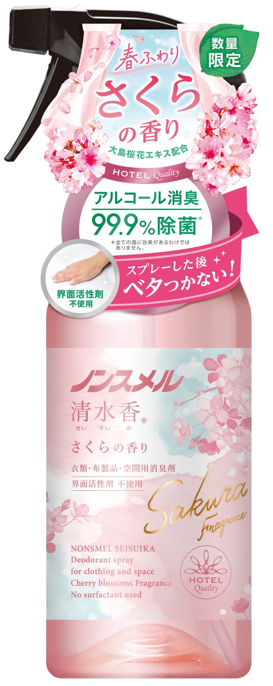 アルコール消臭×界面活性剤ゼロ処方で、乾きが速く、ベタつかない!ホテルクオリティの消臭剤に春限定の香りが登場!『ノンスメル清水香(せいすいか) さくらの香り』シリーズ 数量限定発売