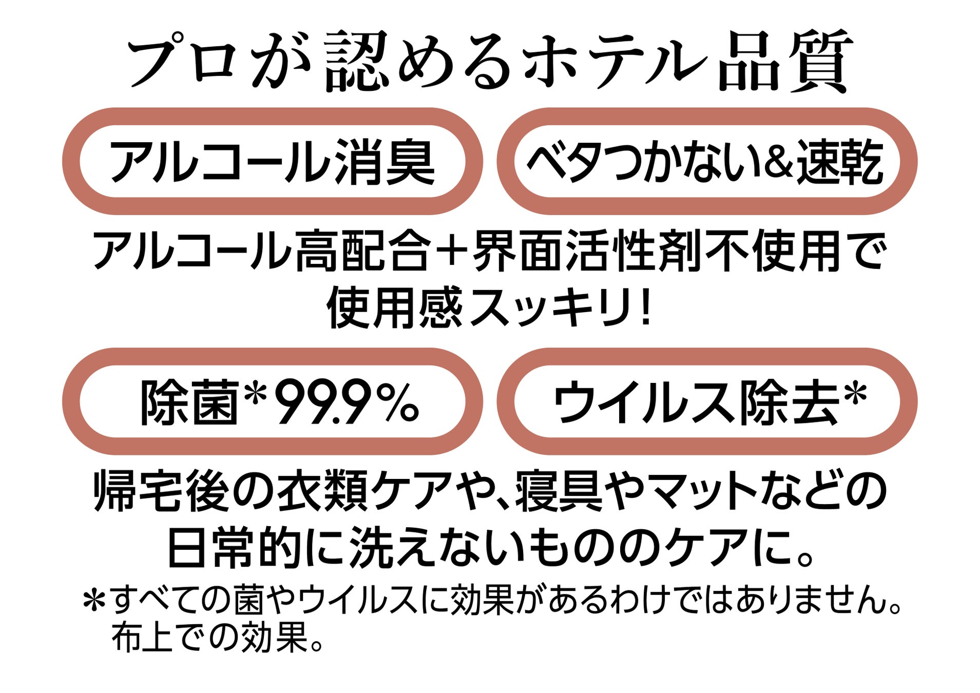 『ノンスメル清水香』は、プロ用消臭剤「清水香®」と共同開発した、衣類・布製品・空間用消臭剤です。アルコールを高濃度で配合した独自処方で、スプレー後の乾きが速く、衣類・布製品についた気になるニオイ*1をすばやく消臭し、高い除菌効果*2やウイルス除去効果*3も備えています。さらに、ベタつきの原因となる界面活性剤を使わない「界面活性剤ゼロ処方」を採用し、使用後のベタつきも気になりません。