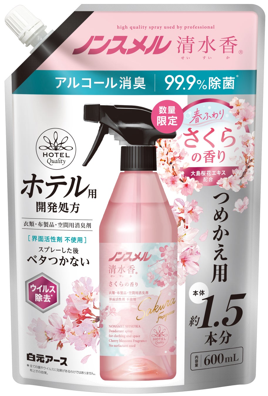 白元アース株式会社(本社:東京都足立区、社長:吉村一人)は、ホテルクオリティの衣類・布製品・空間用消臭剤「ノンスメル清水香(せいすいか)」より、春限定の『さくらの香り』シリーズを12月1日より数量限定発売いたします。