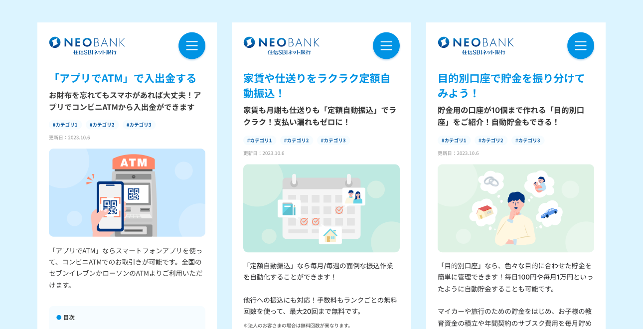 『つかいかたガイド』の記事では、馴染みのない言葉の使用は避け、親しみやすくわかりやすい表現で住信SBIネット銀行のサービスの基本機能はもちろん、さらに便利にご利用いただける機能を紹介しています。