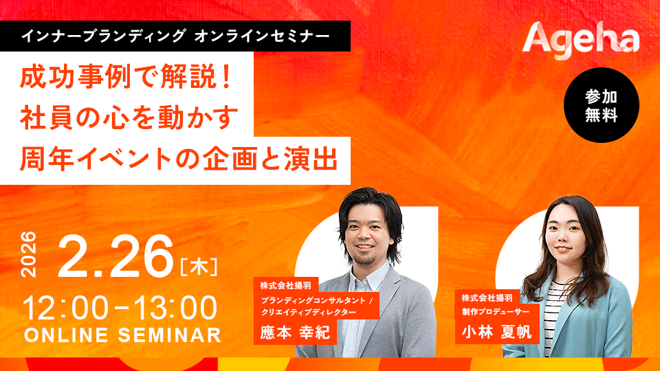 コーポレートブランディング支援を行う株式会社揚羽(東京都中央区 代表取締役社長:湊 剛宏 証券コード:9330)は、2026年2月26日(木)に「成功事例で解説!社員の心を動かす周年イベントの企画と演出」と題したセミナーを、オンラインで開催します。