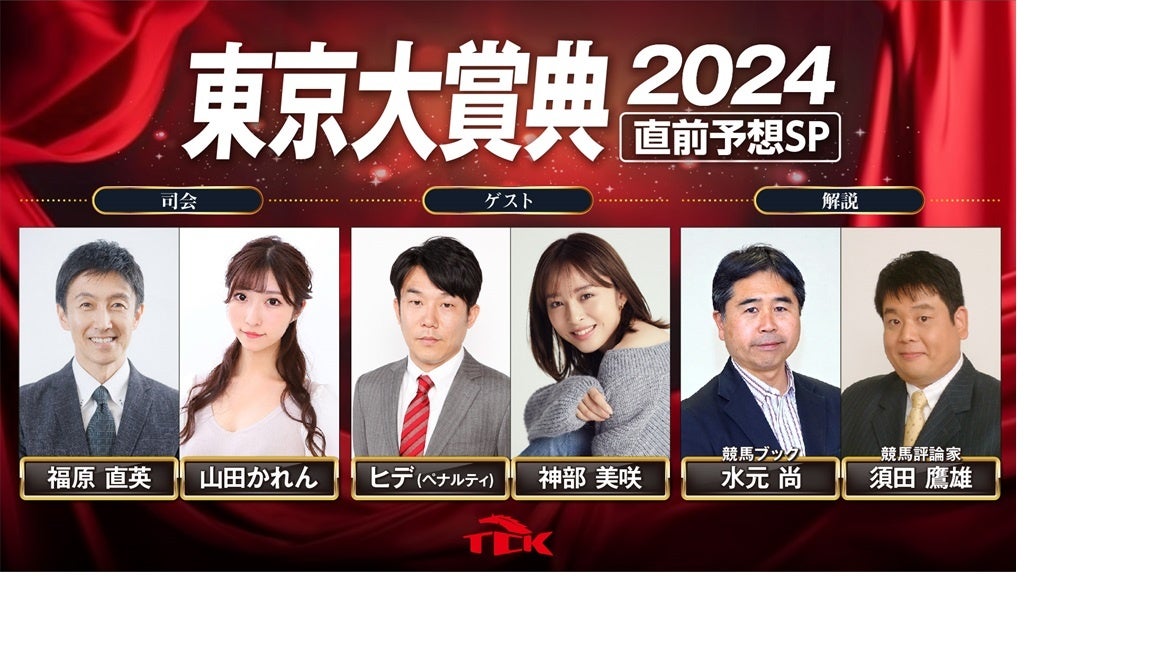 番組では、司会にフリーアナウンサーの福原直英さんと山田かれんさん、ゲストに人気お笑い芸人のペナルティ ヒデさんと競馬番組でレギュラーを務めるタレントの神部美咲さんをお迎えし、解説を務める競馬ブックの水元尚記者、競馬評論家の須田鷹雄さんとともに東京大賞典を徹底的に分析し予想します。