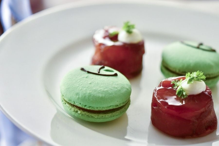 真っ赤なビジュアルが目を惹く、りんごのムースとカシスジャムが入ったふんわり食感のムースケーキに、りんごのお酒・シードルを使ったヴェリーヌ。まん丸のフォルムが可愛らしい、青リンゴに見立てたグリーンのマカロンには塩キャラメルのガナッシュを包み込みました。アフタヌーンティーセットに欠かせないスコーンは定番のプレーンと、りんごとブルーチーズのマリアージュスコーンの2種類をご用意いたします。