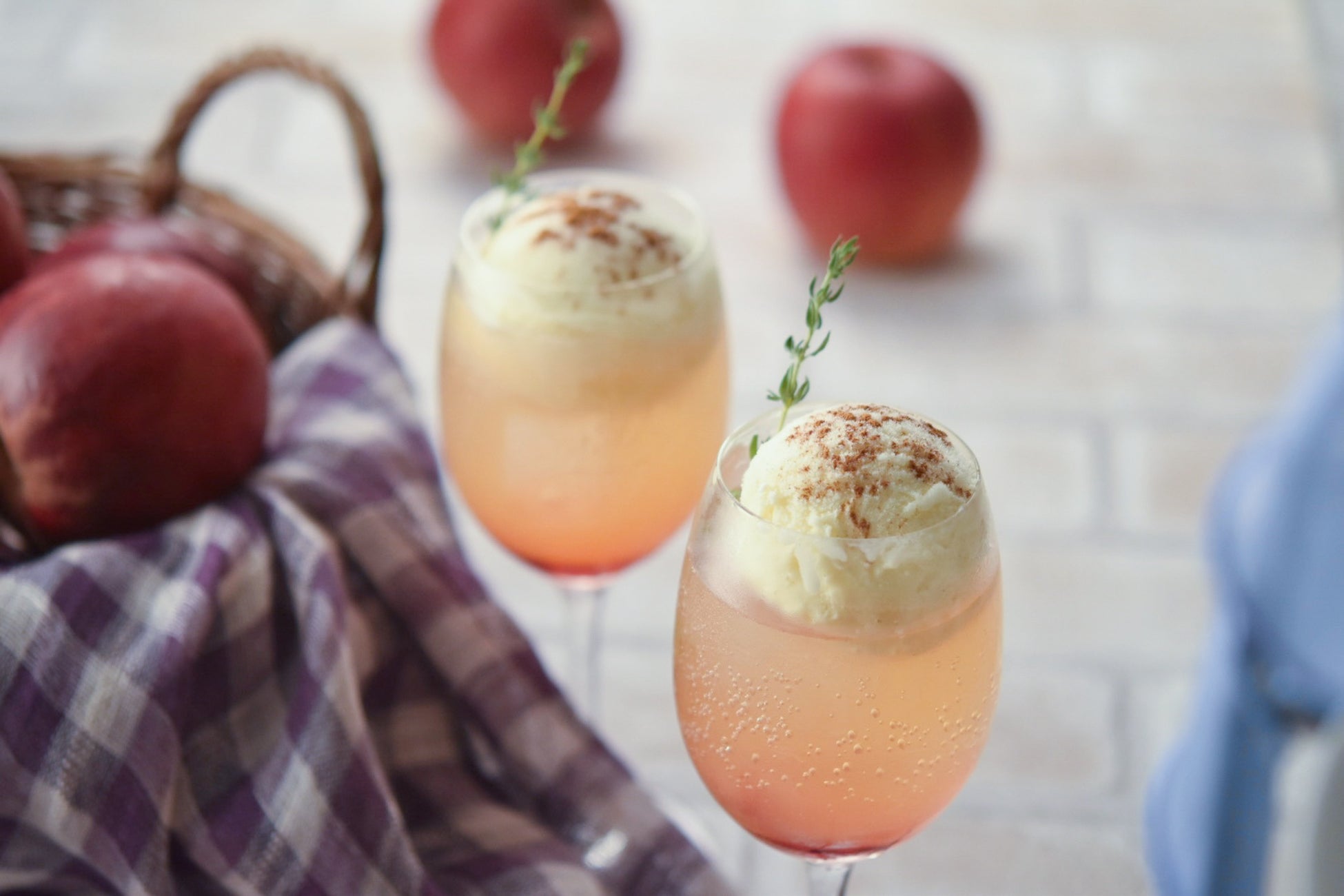 青森県産果汁りんご100%のジュースを使用したモクテル。バニラアイスを乗せて、アップルパイ・ア・ラ・モードのような味わいに。