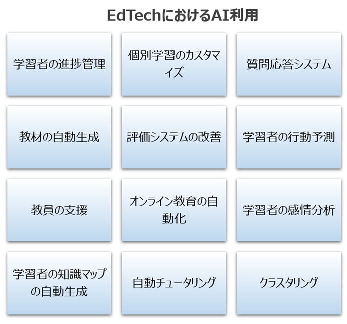 AIを活用することで、学習者のスキルや知識レベルを把握し、その学習者に最適な教材や問題を提供することができます。たとえば、学習者の回答履歴やアクセス履歴を分析することにより、学習者の理解度や弱点を把握し、適切なフィードバックを提供することができます。学習者の学習スタイルを分析し、学習者に最適な学習方法やペースを提供することができます。以下のように様々な活用例があります。