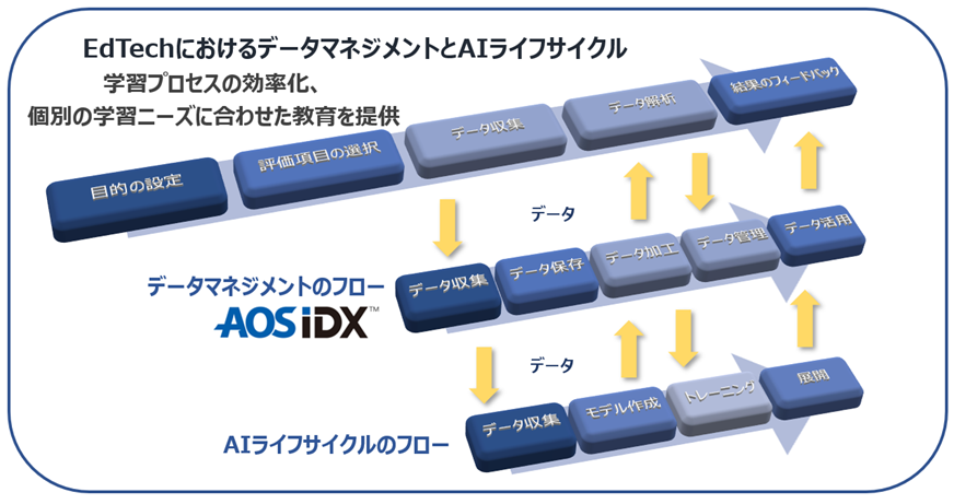 AOS IDXでは、こうしたAIライフサイクルの仕組みとマルチモーダルAIへの適用に基づき、AIデータにおけるAIシステムのためのAIデータ管理を行い、企業における優秀なデータがあって初めて優秀なAIシステムを実現できるというData to AIのコンセプトの元、AOS IDXによって、エドテック分野における営業パフォーマンス向上に向けたプラットフォーム構築を支援します。