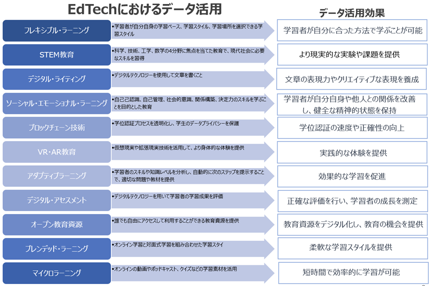 EdTechにおけるデータは多岐にわたりますが、それらを活用することで、より効果的な学習支援や教育の提供が可能となります。データの収集とその分析を通じて、EdTech企業や教育機関がより良いサービスを提供することが期待されます。
