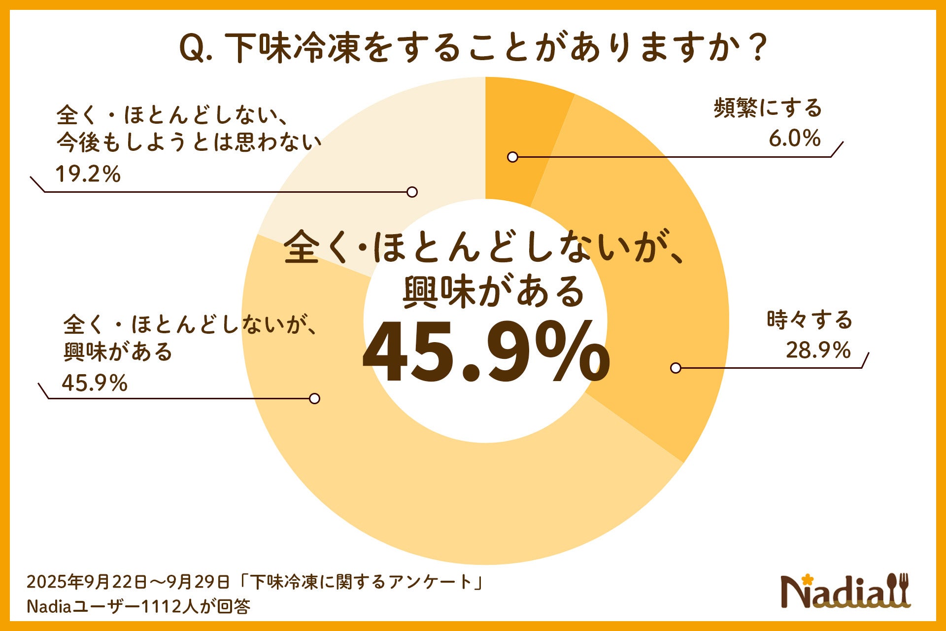 アンケートによると、下味冷凍を「頻繁にする」「時々する」と回答した人は合わせて34.9%でした。一方、「全く・ほとんどしないが、興味がある」は45.9%となり、下味冷凍への潜在的な関心の高さが伺えます。