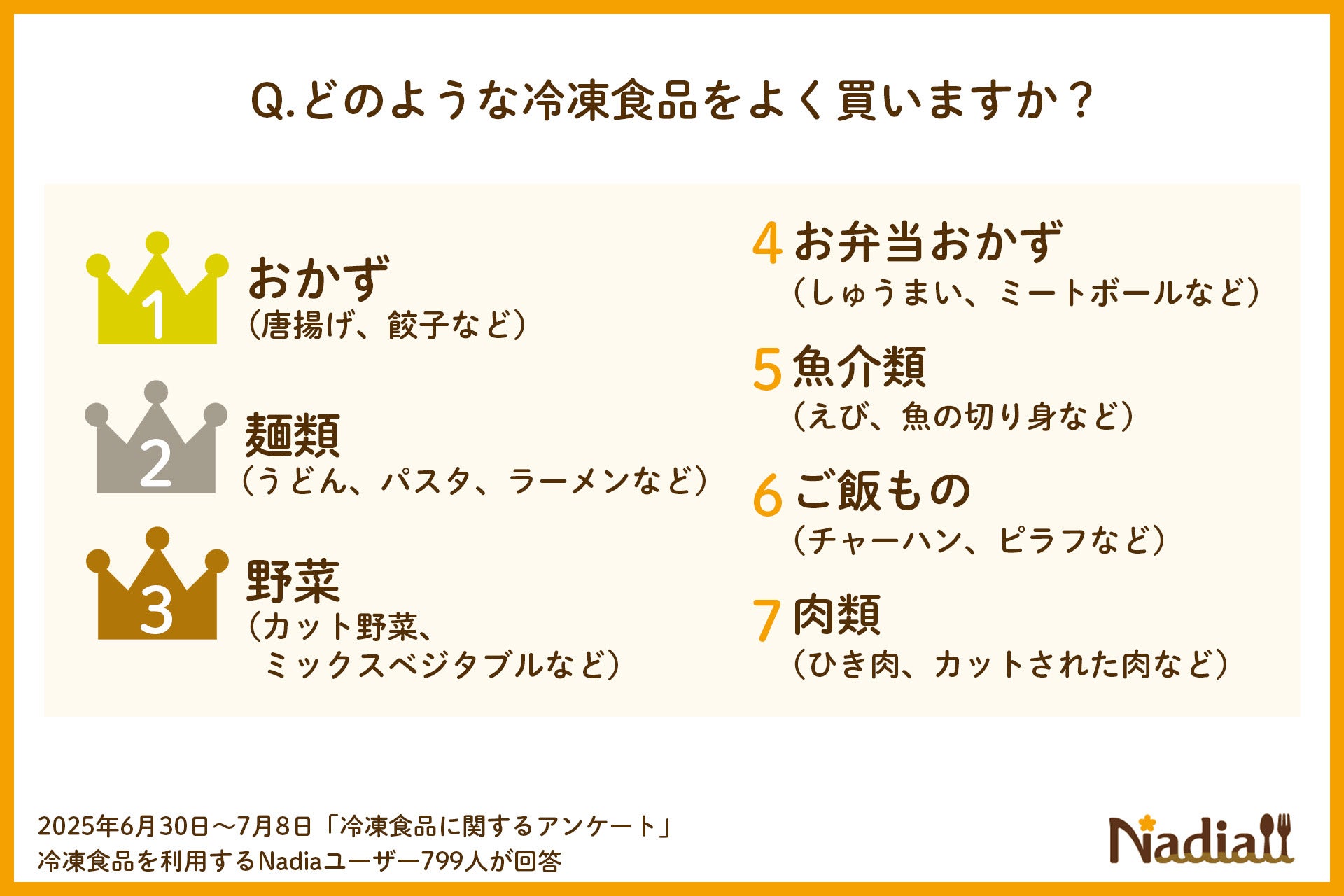 (※)<アンケート調査概要>調査期間:2025年6月30日~7月8日(冷凍食品)/2025年9月22日~9月22日(下味冷凍)、調査機関:自社調査、調査対象:Nadiaに登録しているユーザー、調査方法:メールマガジンにてアンケート回答を募集、回答者数:1031人