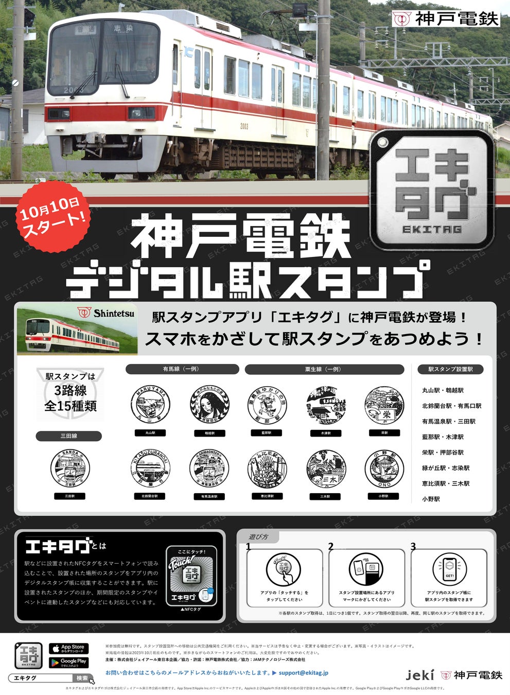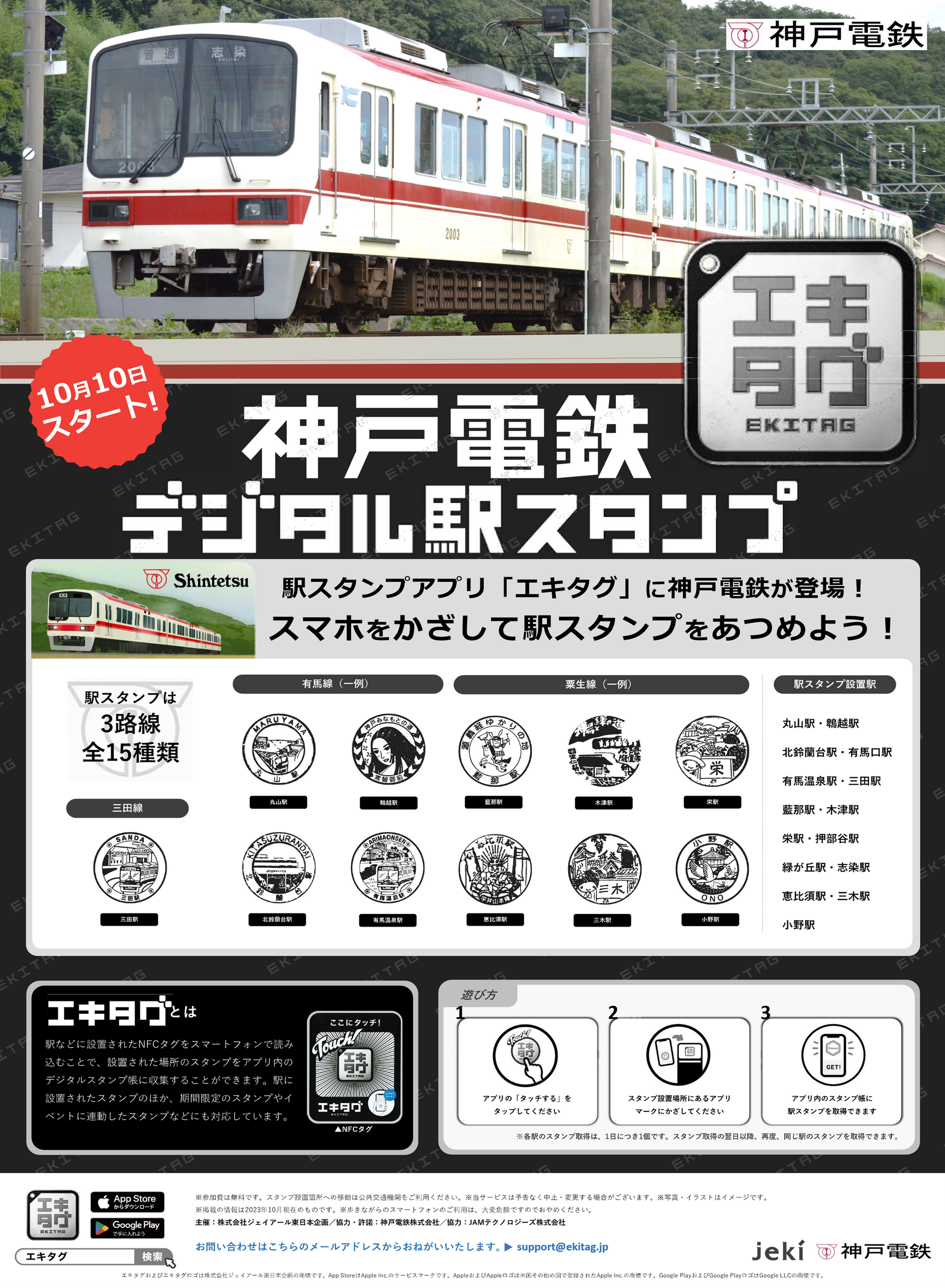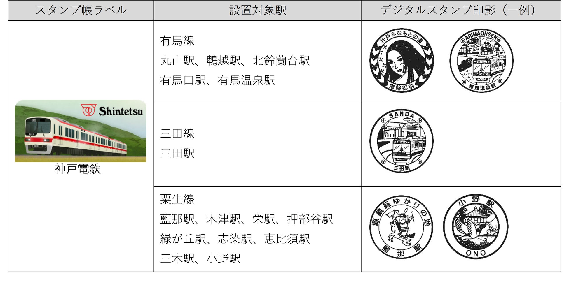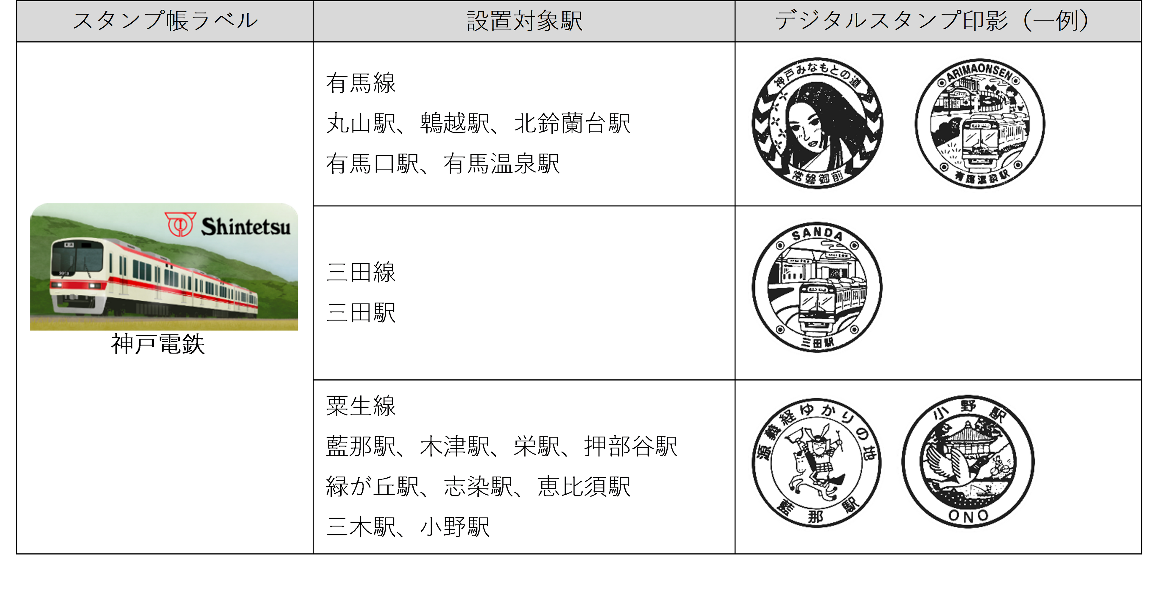 神戸電鉄の有馬線5駅、三田線1駅、粟生線9駅でデジタル駅スタンプをご利用いただけます。
