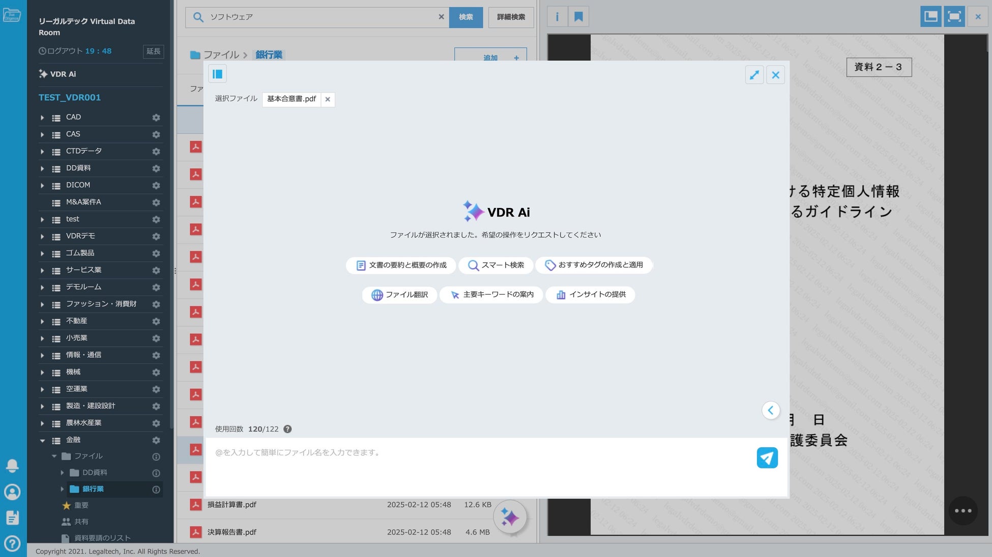 2025年2月17日 リーガルテック株式会社(本社:東京都、代表取締役:佐々木 隆仁)は、バーチャルデータルーム(VDR)「リーガルテックVDR」に、大規模言語モデル(LLM)を活用した生成AI「AI孔明」を統合したことを発表しました。本統合により、M&A、法務、金融、製薬、不動産などの分野におけるデューデリジェンスやコンプライアンス対応を劇的に効率化し、意思決定の迅速化を実現します。